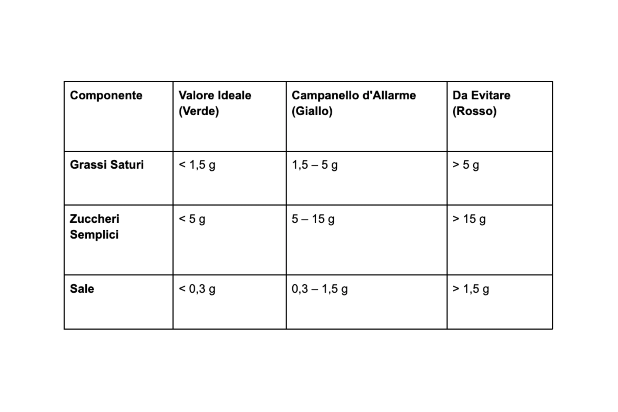 Mentre la lista ingredienti ci parla della qualità, la tabella nutrizionale ci parla della quantità di nutrienti. Per non perdersi tra i numeri, è utile concentrarsi su tre parametri critici riferiti a 100 g di prodotto: i grassi saturi, gli zuccheri semplici e il sale.